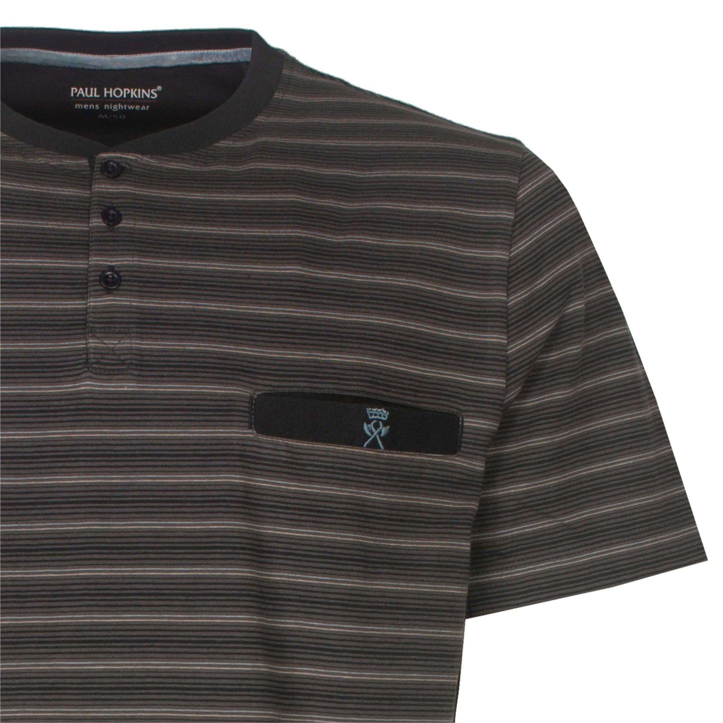 Deze Paul Hopkins Heren Shortama biedt optimaal comfort voor warme nachten. De set bestaat uit een gestreept T-shirt met korte mouwen en henley hals, en een effen zwarte korte broek. Gemaakt van 100% gekamde katoen, zorgt deze pyjama set voor een zachte, ademende ervaring met een ruime, comfortabele pasvorm.