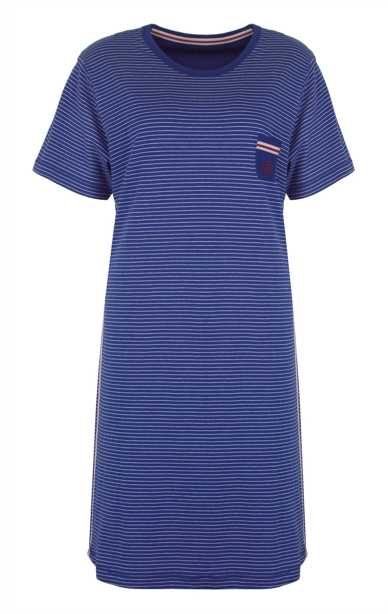 Dit Irresistible Dames Nachthemd in kobalt blauw is een stijlvolle en comfortabele keuze voor een goede nachtrust. Gemaakt van 100% gekamde katoen, biedt het ademend comfort en minimale krimp. Het nachthemd heeft een ronde hals met marine boordje, korte mouwen en een allover streepdessin. Afgewerkt met een geborduurd logo op het borstzakje en sportieve tape langs de zijnaad voor een moderne touch.