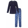 Deze Medaillon Dames Pyjama biedt luxe en comfort in één. Gemaakt van 100% gekamde katoen, combineert de set een klassieke navy top met een gebloemde broek. De top heeft een ronde hals met henley-sluiting en kanten details, terwijl de lichtblauwe broek een elegante bloemen- en vogelprint draagt. Perfect voor een stijlvolle en comfortabele nachtrust.