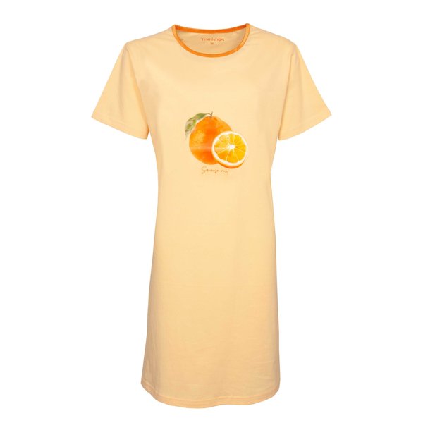 Dit Temptation Dames Nachthemd is een verfrissende toevoeging aan je slaapgarderobe. Gemaakt van 100% gekamde katoen, biedt dit licht oranje bigshirt optimaal comfort en een luchtige pasvorm. Met een lengte van 95 cm en korte mouwen is het perfect voor warme zomernachten. De eyecatcher is de levendige sinaasappelprint op de borst met de speelse tekst 'Squeeze me!'.